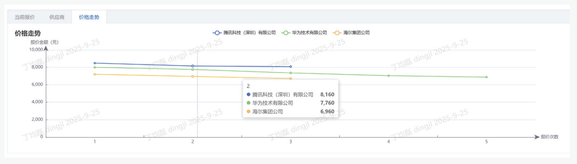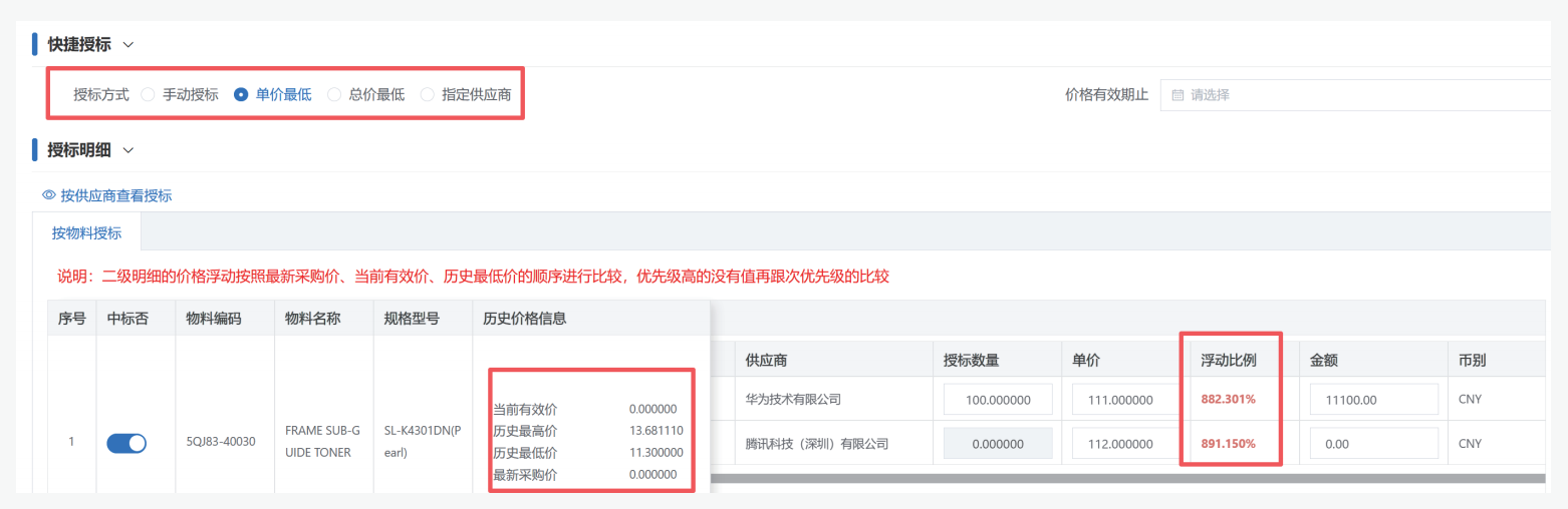 SRM为企业提供了强大的在线寻源工具箱。它可以将询比价、招投标、竞价等场景搬到线上。供应商通过供应商门户在线报价,系统自动横向比对生成比价单。同时中标价格可以形成价格库和历史价格趋势,作为后期定价参考。实现了选商定价的阳光化、透明化,直接赋能企业降本。