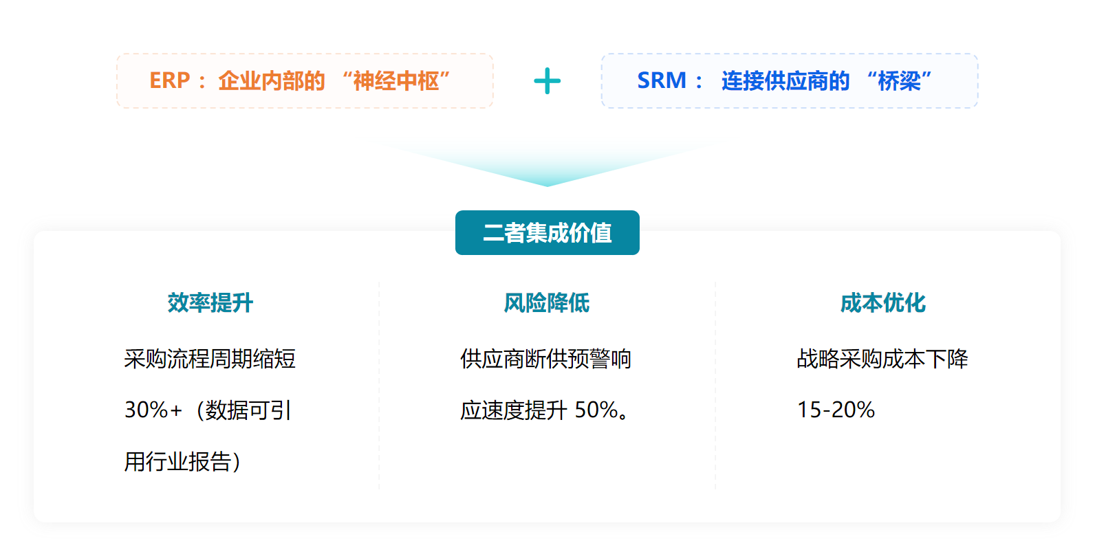 现在的市场环境下,单个企业与企业之间的竞争,已经演变为了一条供应链与另一条供应链之间的整体比拼。单纯依靠ERP系统管理采购已经不能适应当下管理需求,ERP的“内控力”与 SRM 的“连接力”协同发力,SRM实现采供双方无缝协同,ERP实现内部进销存流转,双管齐下提升全链条流转效率,才能驱动采购体系的高效运转