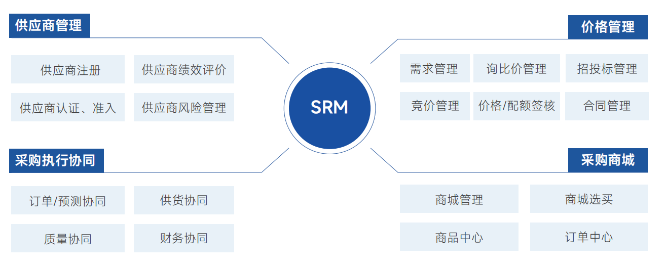 SRM倾向外部协同: 它的主战场是供应商准入认证、招标比价、战略寻源等,全方位服务于外部供应商的开发与高频的采供业务协同。