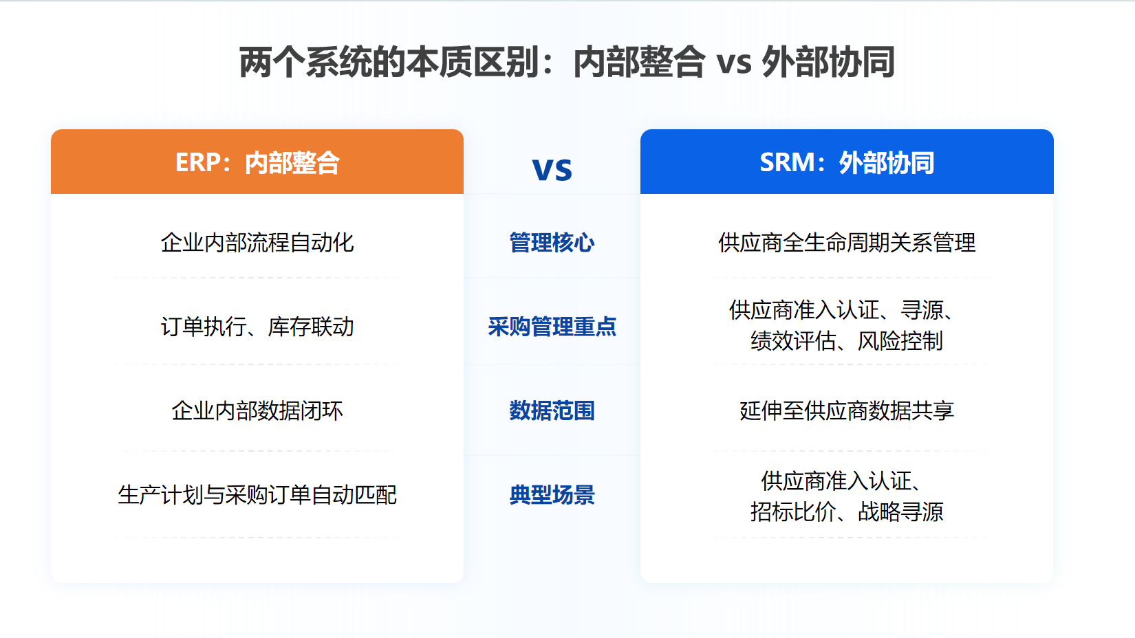 理解了ERP与SRM的定义,二者的界限便清晰可见:ERP向内求效率,SRM向外求协同。 采购本质上是一场大规模的对外协作,而ERP“对内管理”的底层基因,决定了它无法独自撑起复杂的供应商协同需求。两者的差异主要体现在以下四个核心维度:
