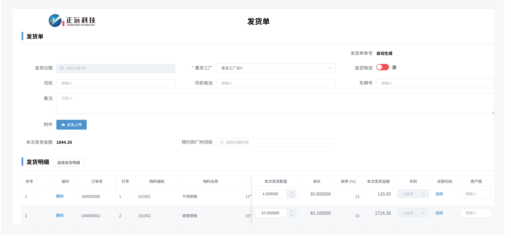 当计划在系统中释放需求(或者前端订单触发需求)时,系统会自动进行库存校验,缺口数据自动流转到正远SRM平台生成采购申请。