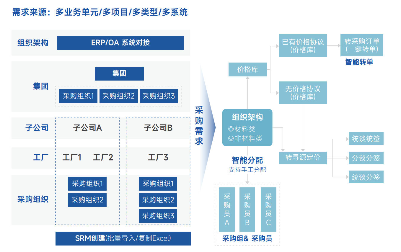 比如先进的平台型SRM系统,它的一个核心设计理念就是“全域需求集成”。不管是来自生产ERP的物料计划,还是来自OA系统的日常申请,都能打破系统孤岛,统一汇集到一个专属的“需求池”里。这就等于给各个部门建了一个公共的作战指挥室,销售的预测、生产的排期、采购的寻源都在一个透明的平台上流转。谁也别甩锅,大家一起在交付率、库存周转和采购成本这个不可能三角中,找到最适合当下业务的平衡点。