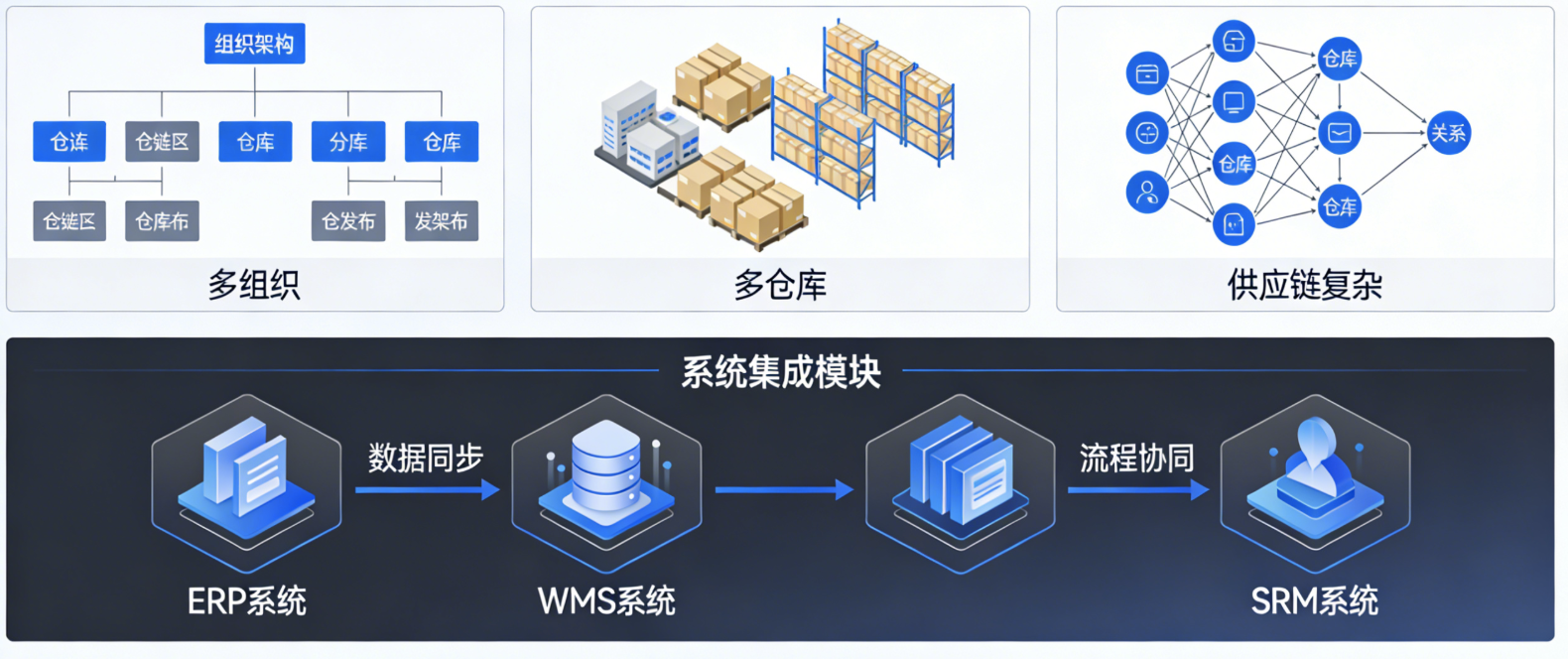 成熟大厂阶段:多组织、多仓库、供应链极其复杂。这时候不仅要全副武装(ERP+WMS+SRM),更核心的是解决系统之间“打架”和“孤岛”的问题,需要更灵活的底层架构。