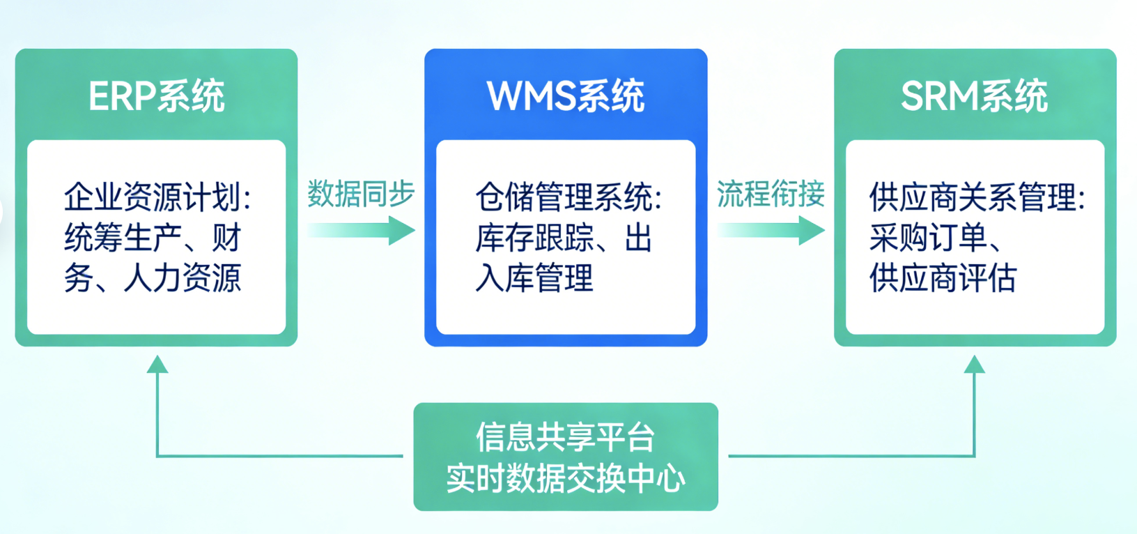 核心逻辑: 在现代化的系统管理中,ERP 负责管好核心资产和财务大账,SRM 负责把触角伸向供应商,而 WMS 负责把手脚落实到仓库现场。三个系统通过数据接口实时对齐,解决了信息传递不及时、账实不符的问题,让企业管理从纸面走向了现场。