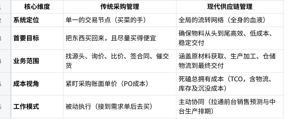 总结一下。采购,解决的是企业“能不能买到东西”的生存问题;而供应链,解决的是企业“能不能长久、高效、低成本运转”的核心竞争力问题。