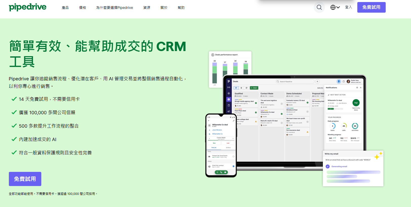 - 核心优势:采用极其直观的“管道”视图管理销售阶段,支持拖拽式操作,以极致的易用性深受一线销售喜爱。