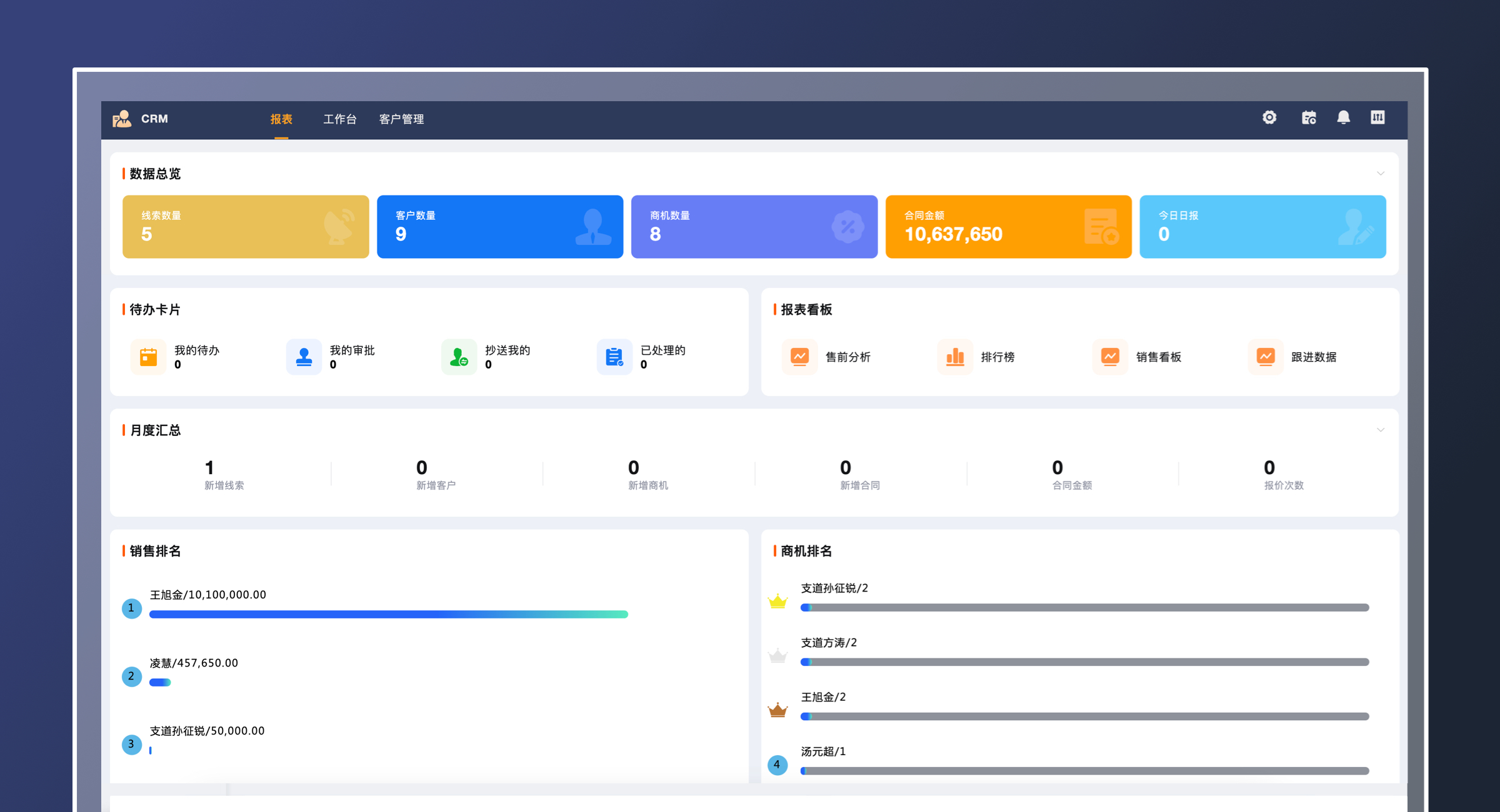 中小企业应优先考虑轻量化SaaS工具(如Zoho, Pipedrive)或高性价比的无代码平台(如支道)。前者开箱即用,成本低;后者虽然需要投入时间配置,但能100%贴合业务,且能随企业发展灵活调整,避免未来“推倒重来”的风险。
