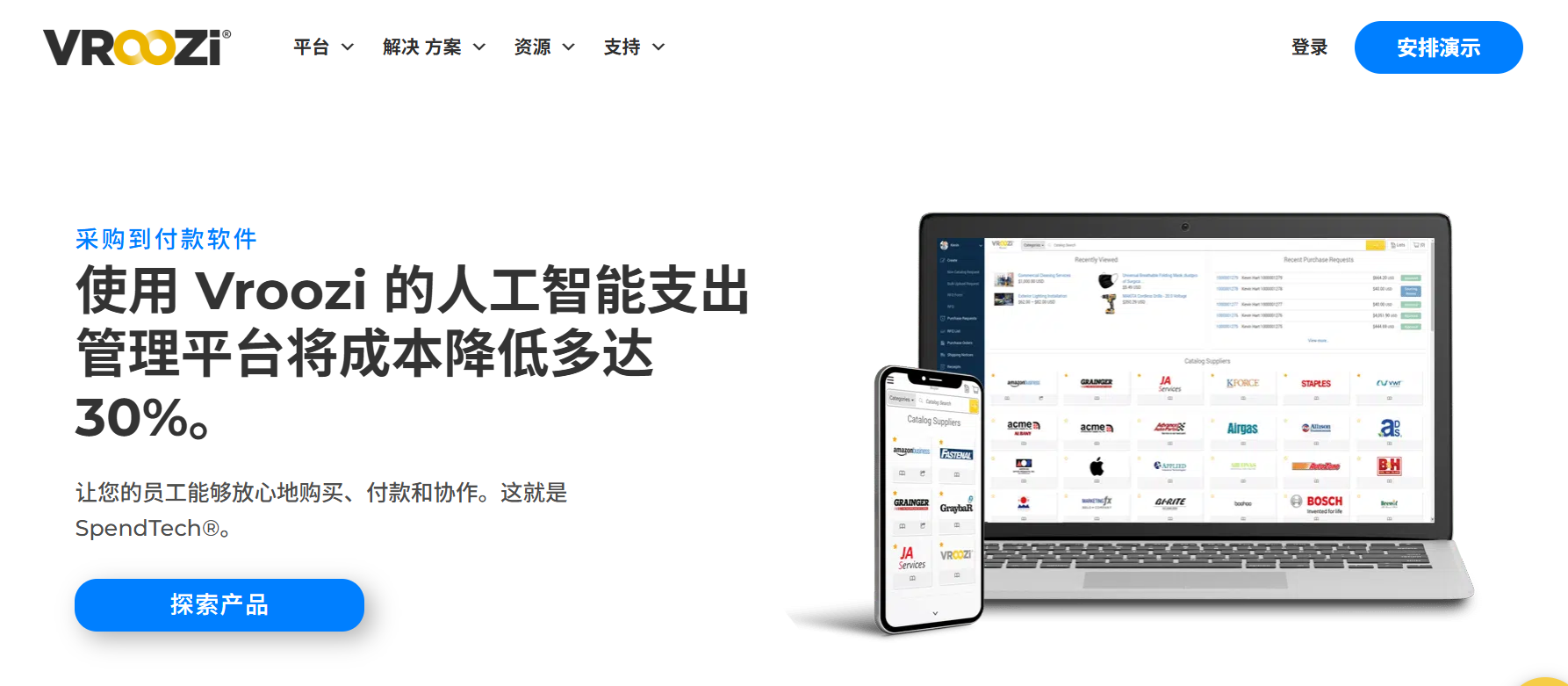 Vroozi 是一款基于云端的智能采购平台,专为中小企业设计,其核心优势在于将人工智能技术与采购流程深度整合。该系统支持从需求申请到发票管理的全周期自动化,尤其擅长处理分散型采购场景。