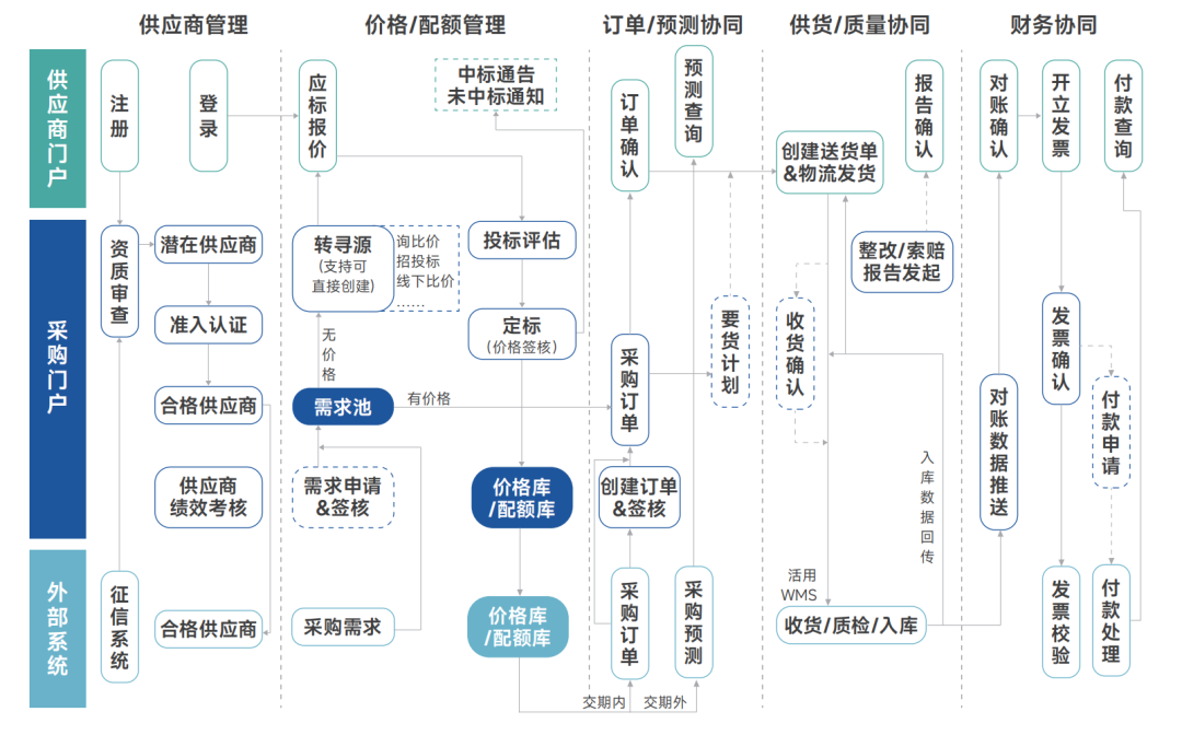 内外协同: 优秀的SRM应具备企业门户+供应商门户的双向驱动能力,弥补传统软件缺乏分发互动传播链的短板。