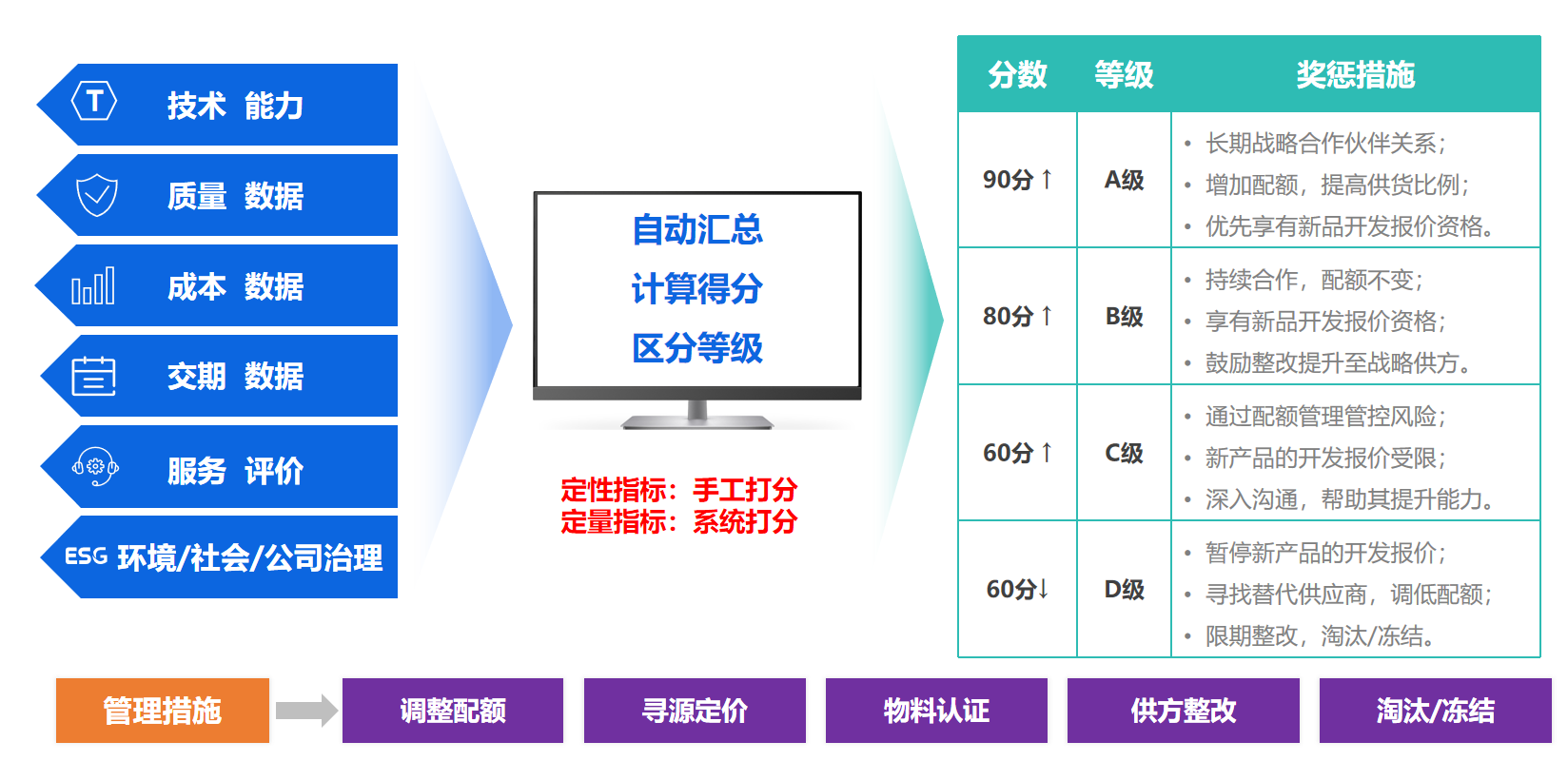 应用: 等级体系直接影响后续的订单配额分配、付款条件、合同深度、技术协同资源等。例如,A级战略供应商可以获得更高的订单分配比例和更优惠的付款账期。