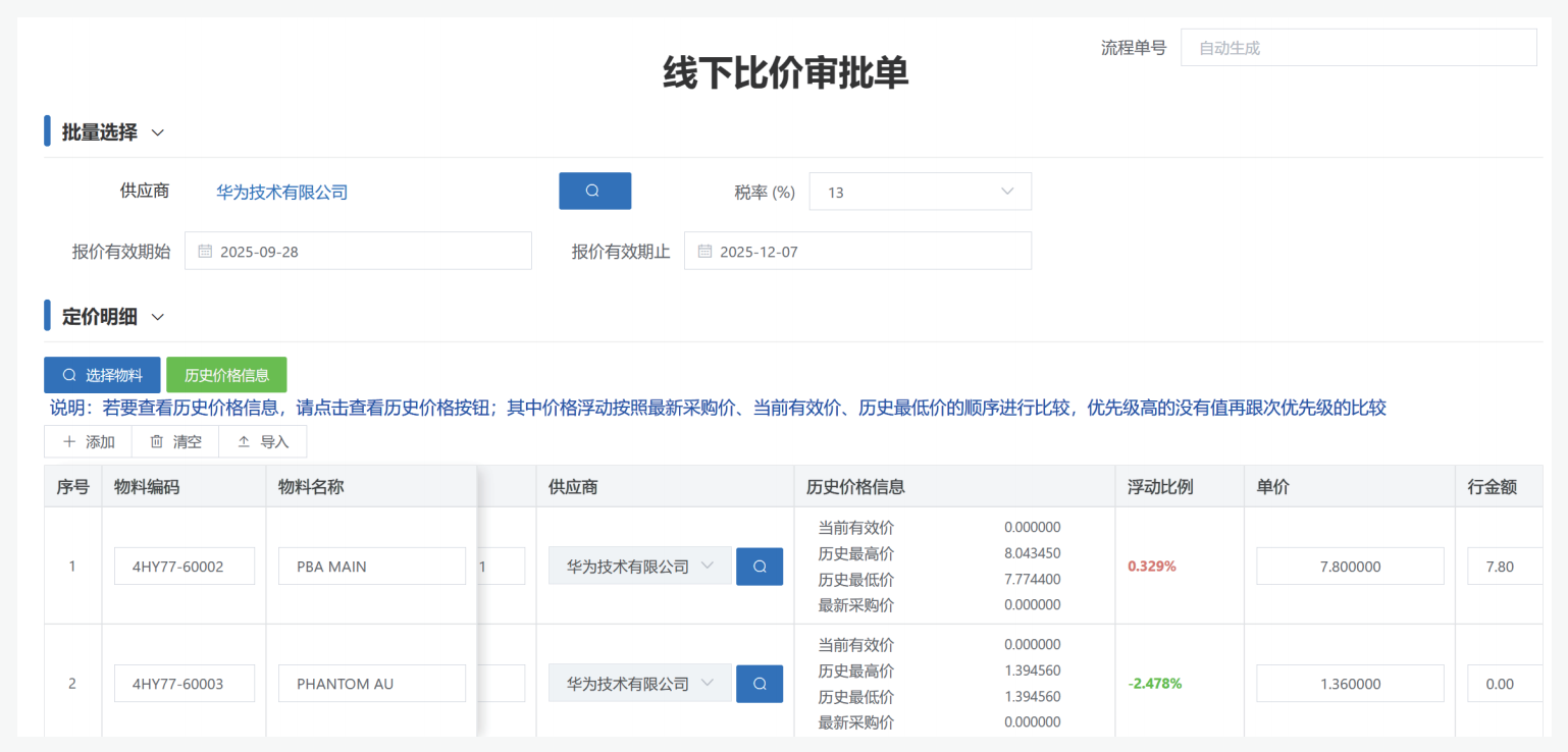- 审计闭环:当采购员选择了非低价供应商时,系统会自动要求关联技术评分或理由,让每一分钱的支出都有原因。