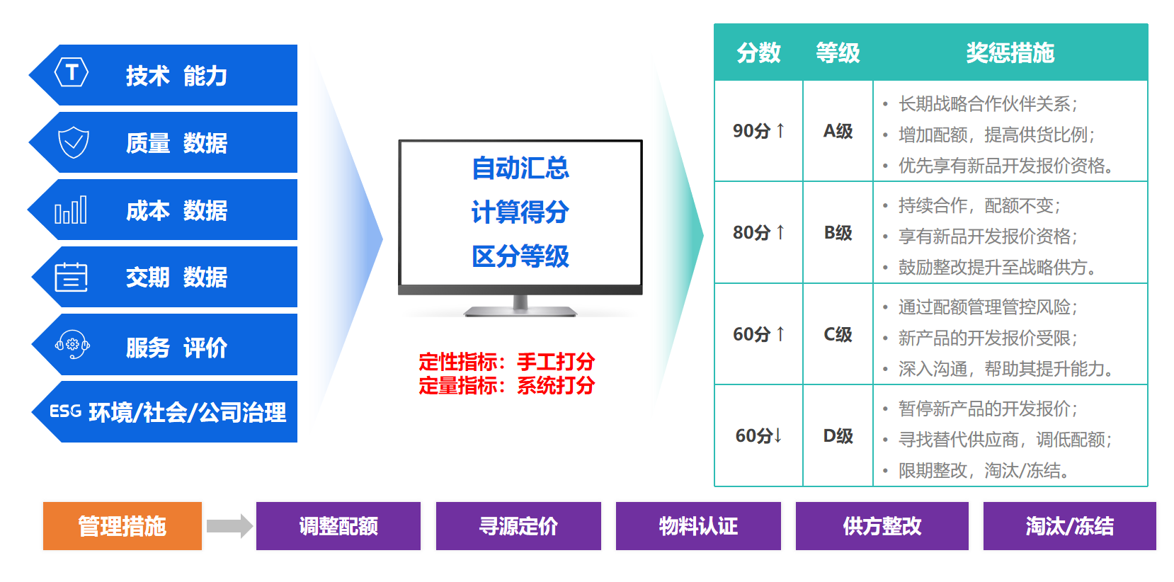 - 非价格维度:给技术方案、交期、服务响应设置权重。