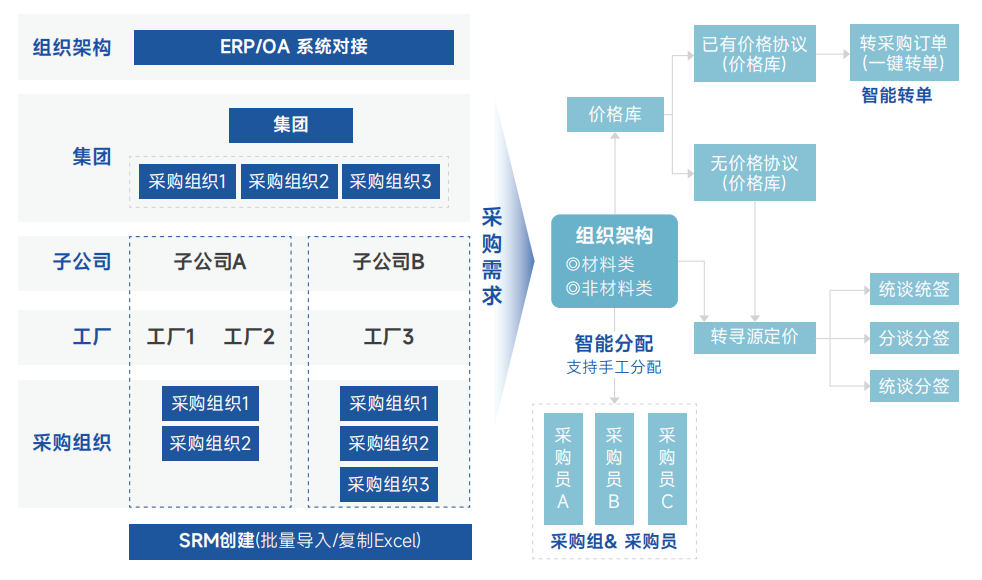 业务部门在ERP系统中提报采购需求后,这些需求会通过接口自动同步到SRM系统的“需求池”中。采购人员在SRM中以此为抓手,发起询比价或招投标流程。当在SRM中确定了中标供应商和最终价格后,系统会根据寻源结果生成采购订单或价格协议,并将这些关键的定价数据实时同步回ERP系统,作为后续执行的标准依据。