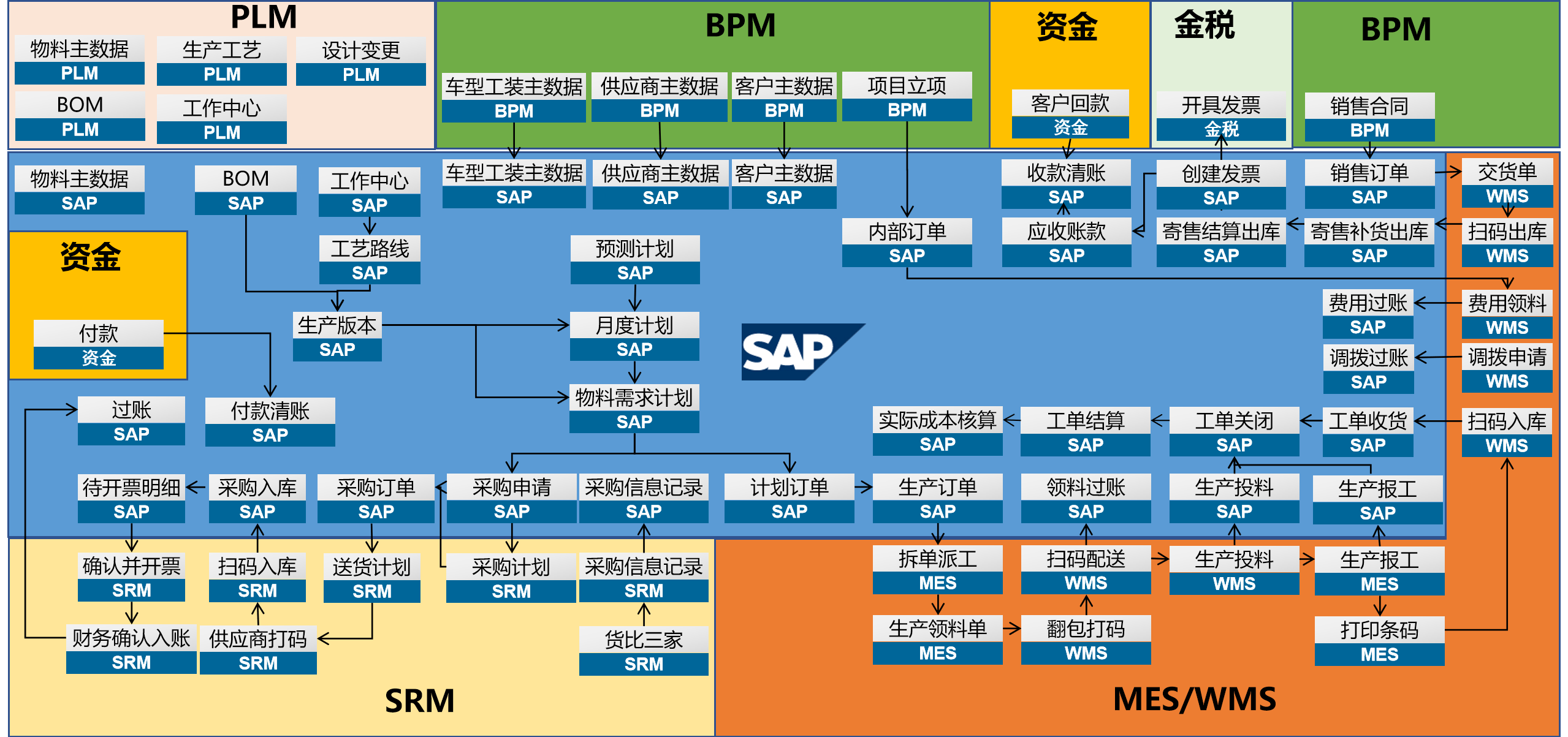 引入SRM系统后: SAP产生的采购申请数据自动流转至SRM,触发在线招标/询价;SRM完成寻源后,将价格与供应商结果回写SAP,由SAP生成正式订单再推送至SRM供应商门户。供应商在线接单、反馈进度并上传发货信息;货物到达后,仓库通过WMS扫码入库,系统瞬间自动关联订单与质检数据,并触发MES的生产备料指令。在财务对账环节,SRM自动抓取SAP的入库单生成对账明细,供应商确认开票后,信息无缝同步至SAP财务模块。