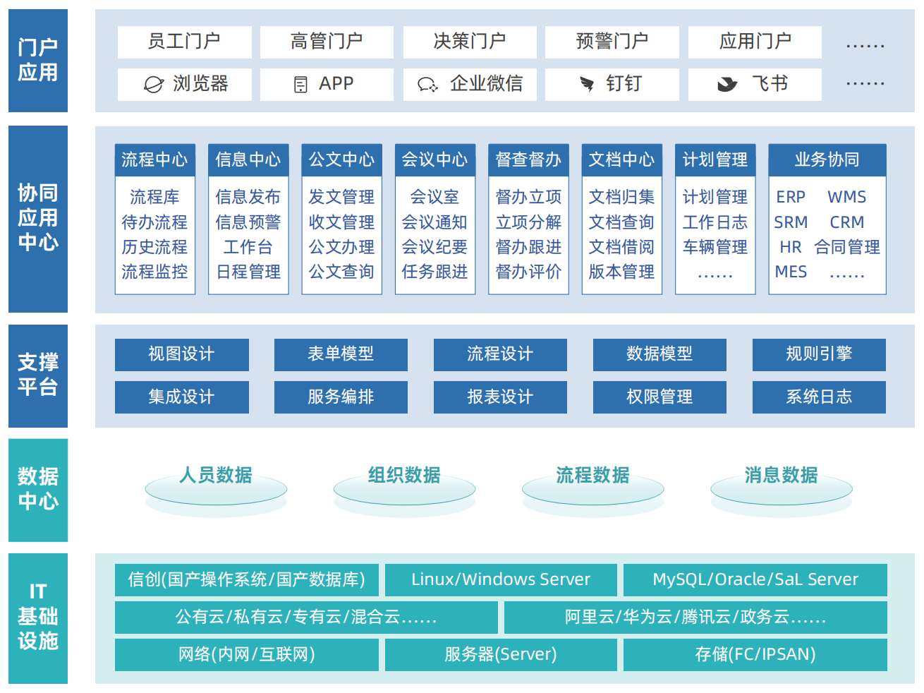 - "五大核心":统一门户,融合各项信息数据,集中分类展现;统一流程,规范工作流程、明晰工作职责、支撑企业管控、复制管理制度;知识沉淀,积累知识资源、复制知识经验、管理信息知识;业务协作,减少通成本,提升工作效率;iPaaS集成,集成多业务应用系统的信息资源。