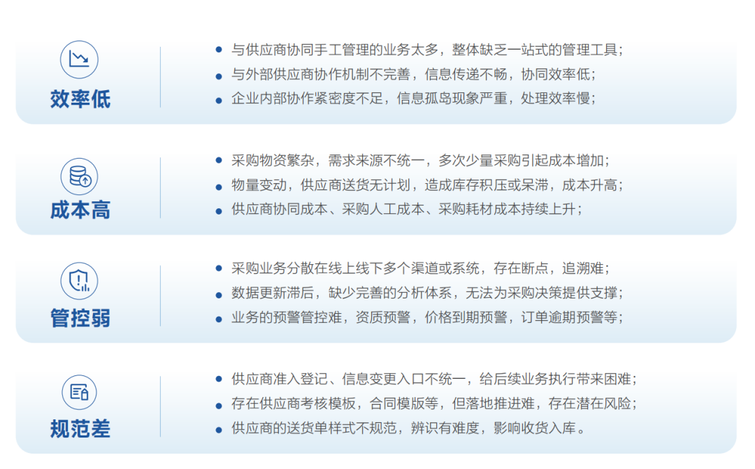 传统采购管理采用手工+ERP相结合的方式,采购过程以手工执行及线下管理为主,采购结果写入ERP系统。在这种模式下,企业面临着诸多典型的管理问题,集中体现为效率低、成本高、管控弱、规范差。