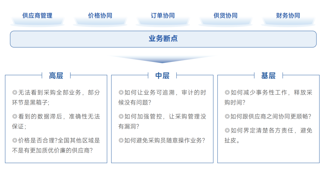 对基层人员而言,因采购执行的事务性工作而承受大量工作量,如何减少事务性工作、释放采购时间,如何与供应商之间的协同更顺畅,如何界定清楚责任、避免扯皮,是他们关注的焦点。