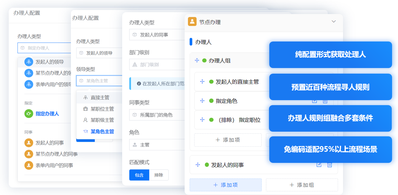 内置遵循 BPMN 2.0 国际标准的流程引擎,预置超过100种流程办理人规则。无论是会签、转办、加签,还是基于角色、数据的复杂寻人,均可通过可视化配置实现,免代码适配95%以上的复杂流程场景。