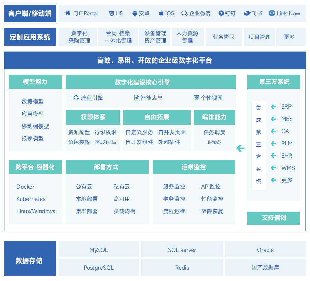 开发者只需在平台进行一次数据建模和流程编排,系统即可自动适配生成 PC端、原生APP、钉钉、企业微信、H5 等多端应用,极大缩短跨平台开发周期。