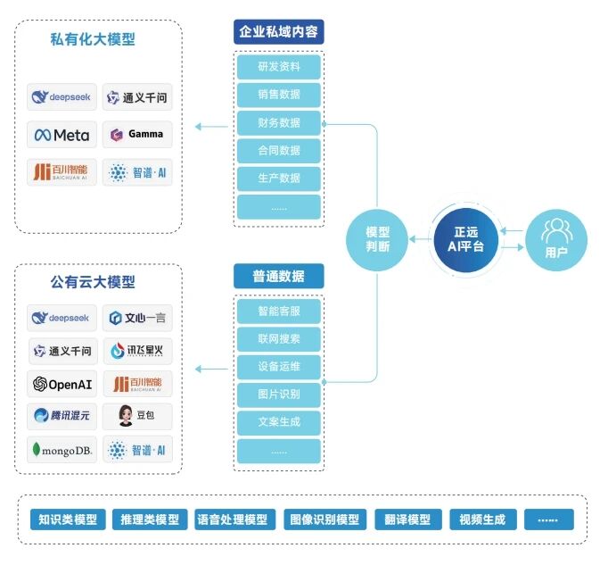 正远AI作为企业级AI平台,集成多模态大模型,通过企业级知识库、建模平台、运营平台,帮助企业构建安全、开放、易用的AI智能平台,打造AI时代智能生产力,为AI在企业中的应用给出可落地的解决方案。